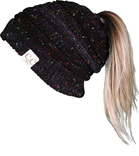 C C Beanietail Soft Stretch Cable Knit Messy High Bun Ponytail Beanie Hat 2 Tone Black Dark Beige